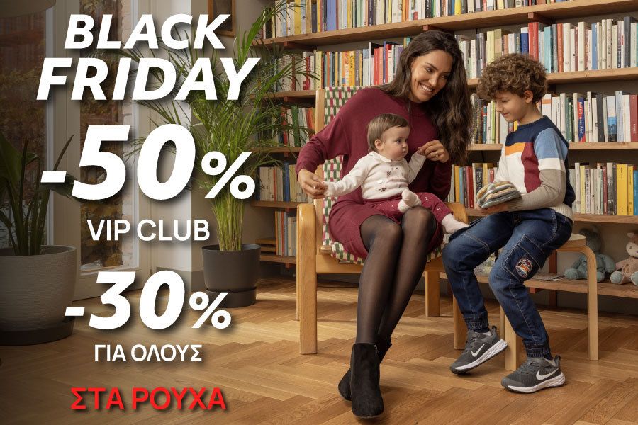 Σε εμάς θα βρείτε μεγάλη ποικιλία σε είδη ρουχισμού και αξεσουάρ για το Νεογέννητο, το Παιδί και τη Μαμά με έκπτωση -50% για τα μέλη της κάρτας Club. Ρούχα σε ξεχωριστά σχέδια και χρώματα που συνδυάζουν άνεση και στυλ. Βαμβακερά φορμάκια για το ευαίσθητο δέρμα του νεογέννητου μωρού σας. Φούτερ, ζακέτες, μπλούζες και φόρμες για αγόρια και κορίτσια για κάθε στιγμή της ημέρας, το σχολείο και το παιχνίδι σε τιμές Black Friday. Ζεστά μπουφάν που προστατεύουν από το κρύο με έκπτωση -50% για τα μέλη της κάρτας. Πιτζάμες, εσώρουχα, κάλτσες και υπνόσακοι για τα πιο γλυκά όνειρα. Ξεχωριστές προτάσεις για τη Μαμά που περιλαμβάνουν μπλούζες, φορέματα και παντελόνια που αγκαλιάζουν την κοιλιά σε αυτό το όμορφο ταξίδι εξυπηρετώντας παράλληλα και τον θηλασμό. Είδη προίκας για κρεβάτι και λίκνο. Δεν λείπουν οι προτάσεις με τους αγαπημένους ήρωες μικρών και μεγάλων, όπως ο Mickey, η Minnie και ο Spiderman.